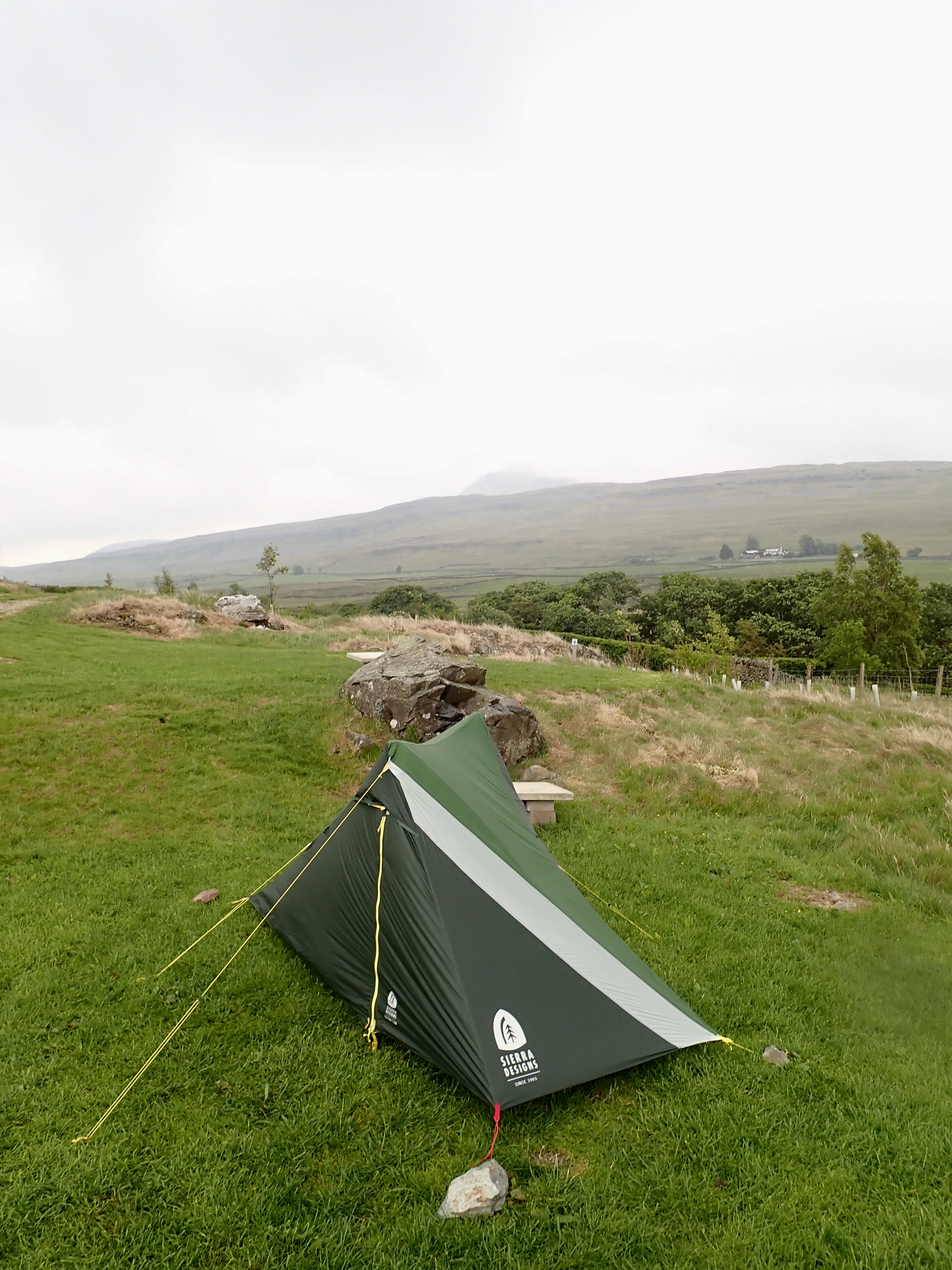 As I reached the end of the ridge, I could see fields criss-crossed by drystone walls stretching out to Ingleton and Ingleton Quarry in the distance. I followed the path as it switch-backed down the grassy slope of the ridge to join a track heading into the dale which took took me past the farm and cottages of Twisleton Hall. I was feeling tired by this point, so it was good to see the campsite sitting on the slopes of the dale below me. After a short walk through a pasture and across Oddie’s Lane, I checked in and wearily pitched my tent. I had a view of the summit of Ingleborough from my pitch, and when the sounds of the nearby quarry finished for the day, I could hear the roar of Beezley Falls away in the trees.