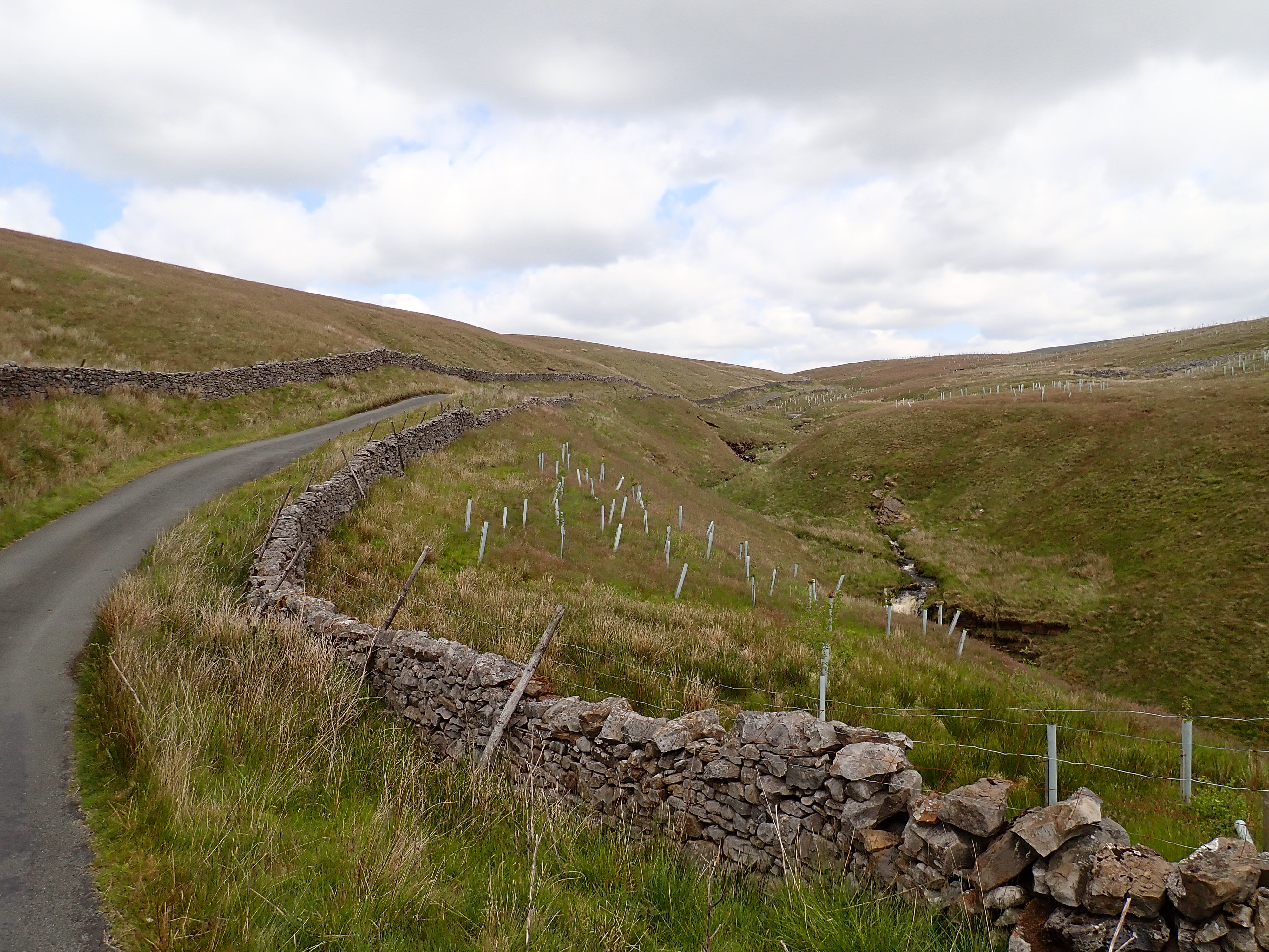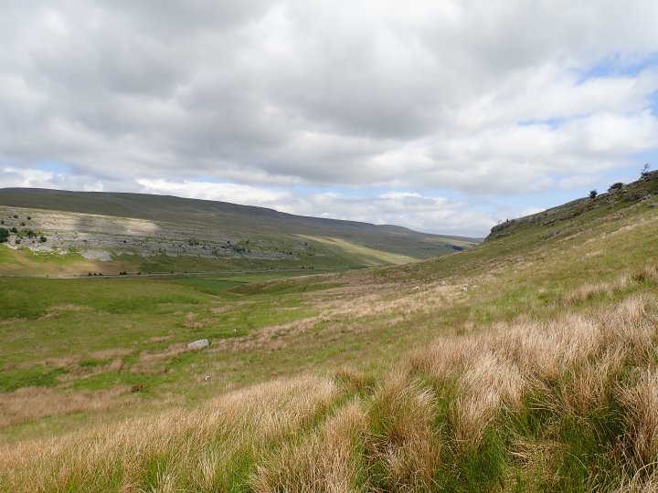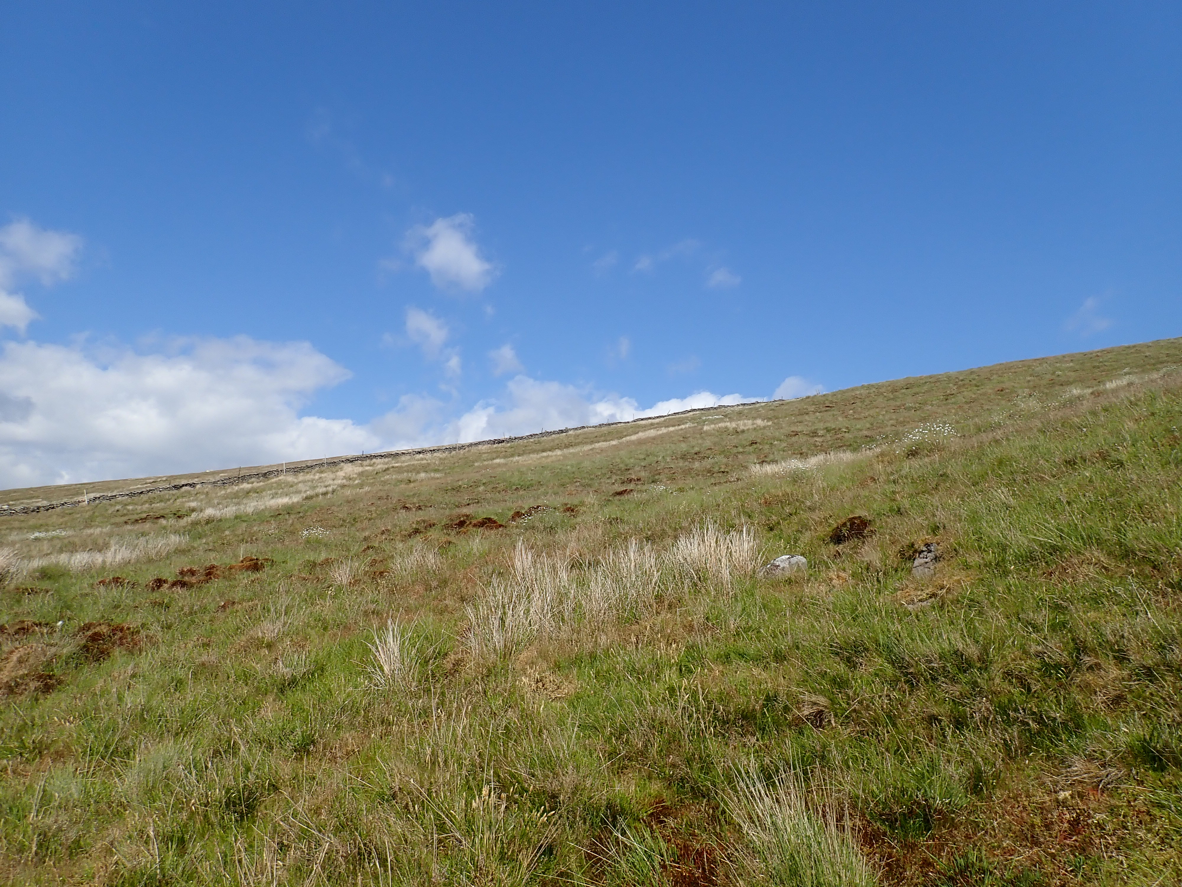 The gradient slowly eased as I reached the saddle and came level with the summit of Whernside. I looked over to the slopes of Whernside to see if traversing around the mountain at this height would be a viable alternative to dropping down into Deepdale and then climbing back out again. This route would be several kilometres across tussock-covered boggy moorland, with several walls to climb over. I decided it wasn’t a viable option and walked down the road into Deepdale.
