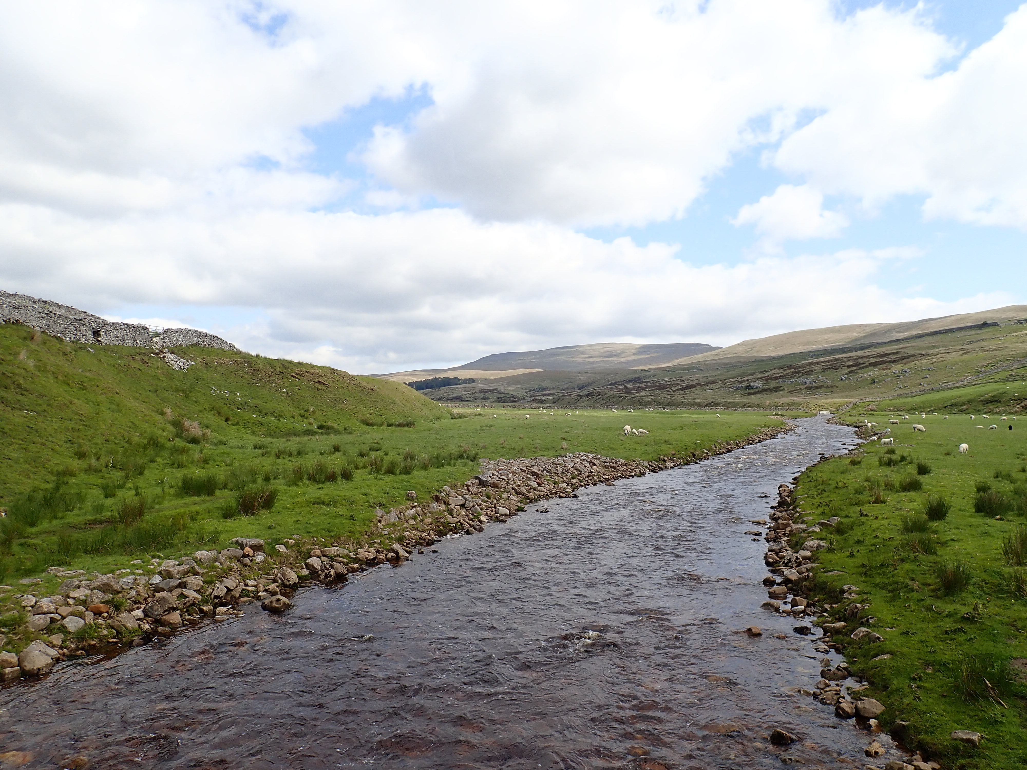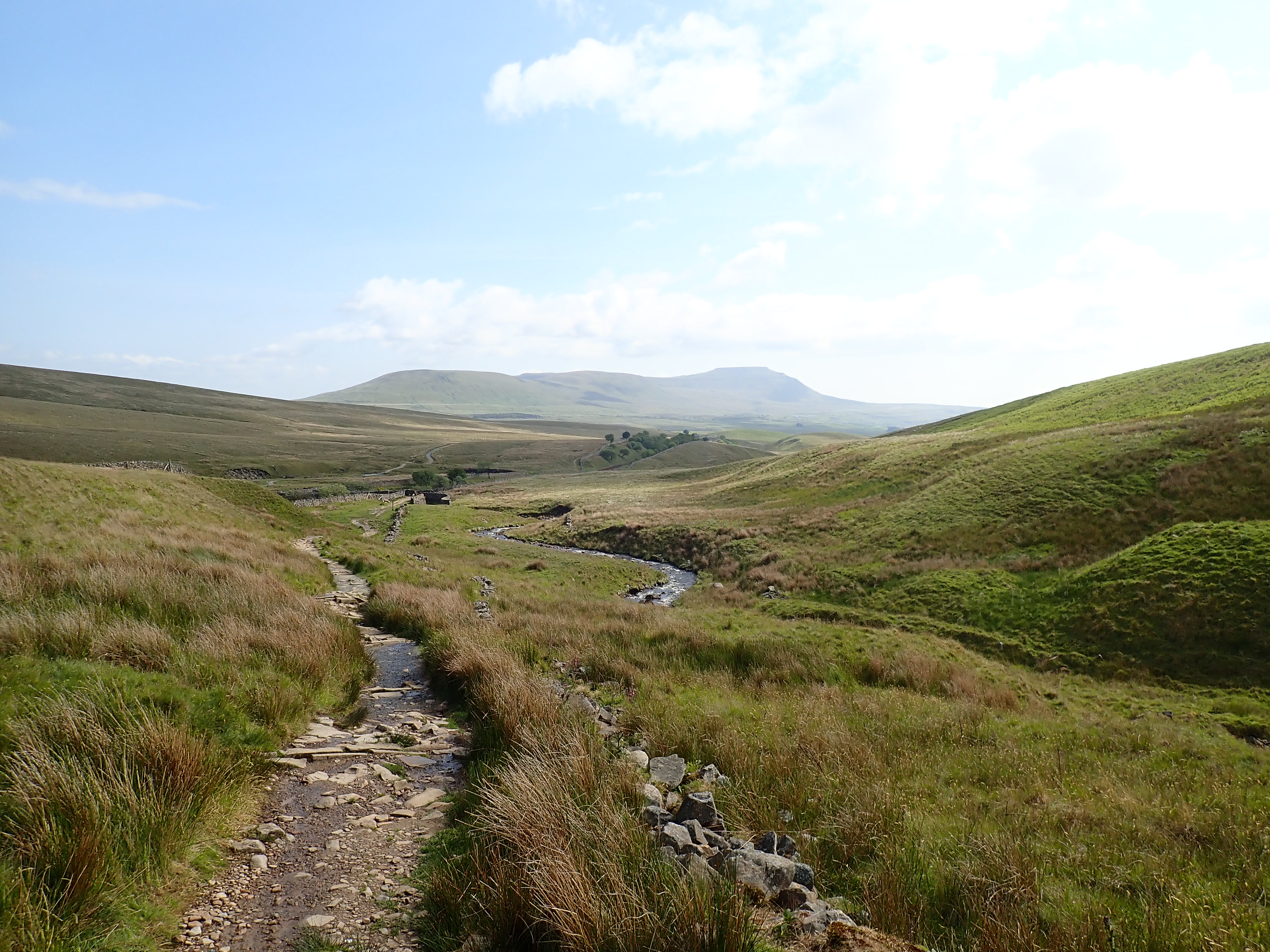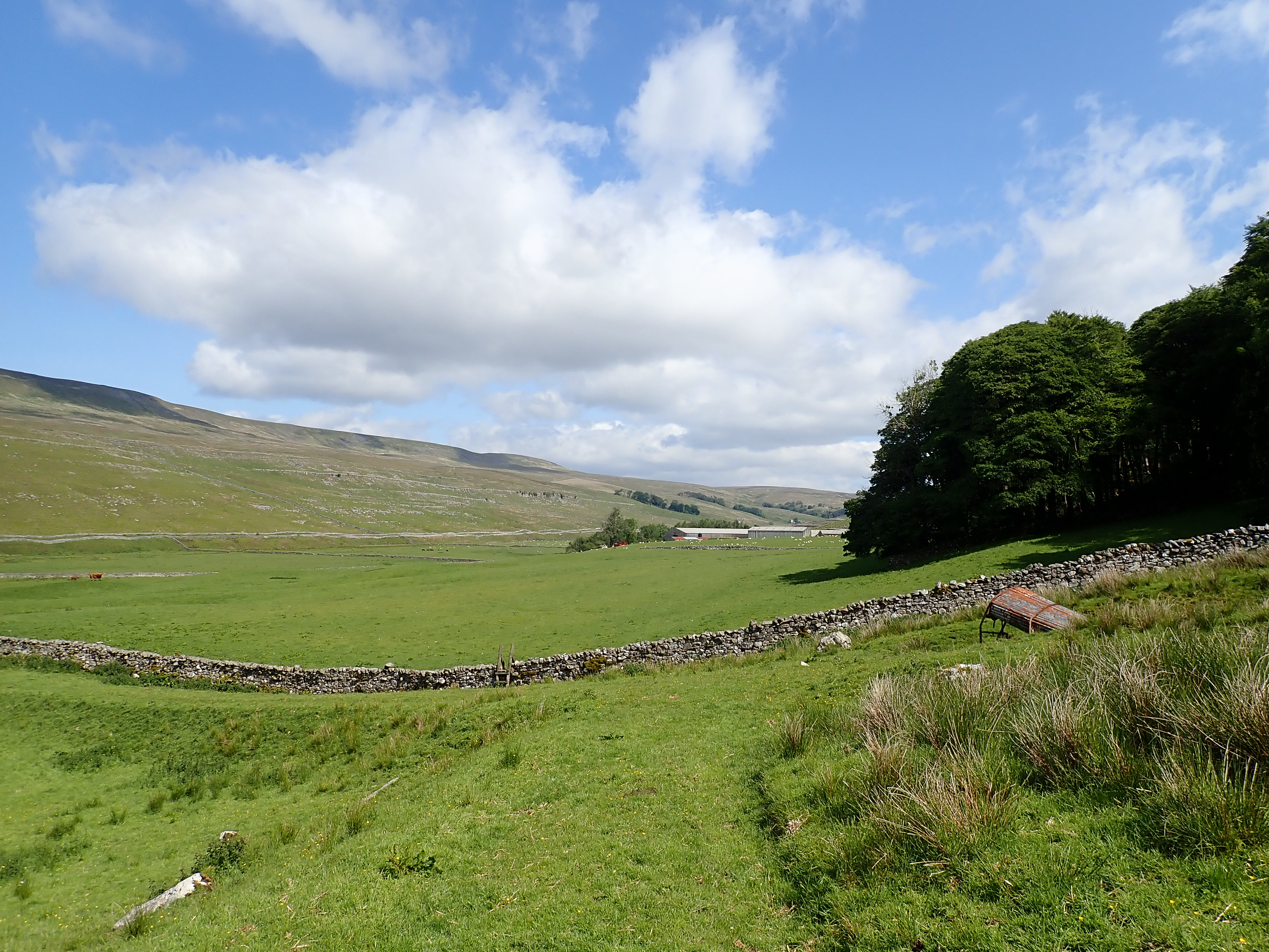 My route traversed the side of Kingsdale before gradually descending to the flat floor of the valley. This shallow dale with limestone scars on either side and bright green pastures at the bottom was pretty. Unfortunately, it was tough going over the rough moorland, with the path occasionally hard to follow. It felt like a long time before I reached the pastures and easier walking near Braida Garth Wood. I passed through Braida Garth farm before crossing fields to a sturdy wooden footbridge over the River Twiss. From here I got good views of Whernside and its SW ridge.