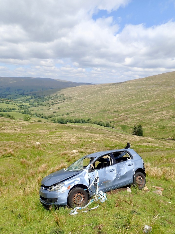 The road I had been following descended steeply into Deepdale for a short distance before taking a sharp turn to the left. It was just after this turn that I reached the footpath I wanted straight on into the dale. As I reached this path, I was amazed to see a wrecked car sitting on the slopes some way below. Its bodywork was bashed up, its windscreen was smashed, and its side windows were gone. Old police tape lay across it. Looking around, I noticed that the section of wire fence at the point where the road turned was newer than the next section of fence. It seemed that this car hadn’t made the turn and had flown off the road. Considering the angle of the slope, it was astonishing that this car had not gone further downhill. I hoped that no one had been too badly hurt in this crash.
