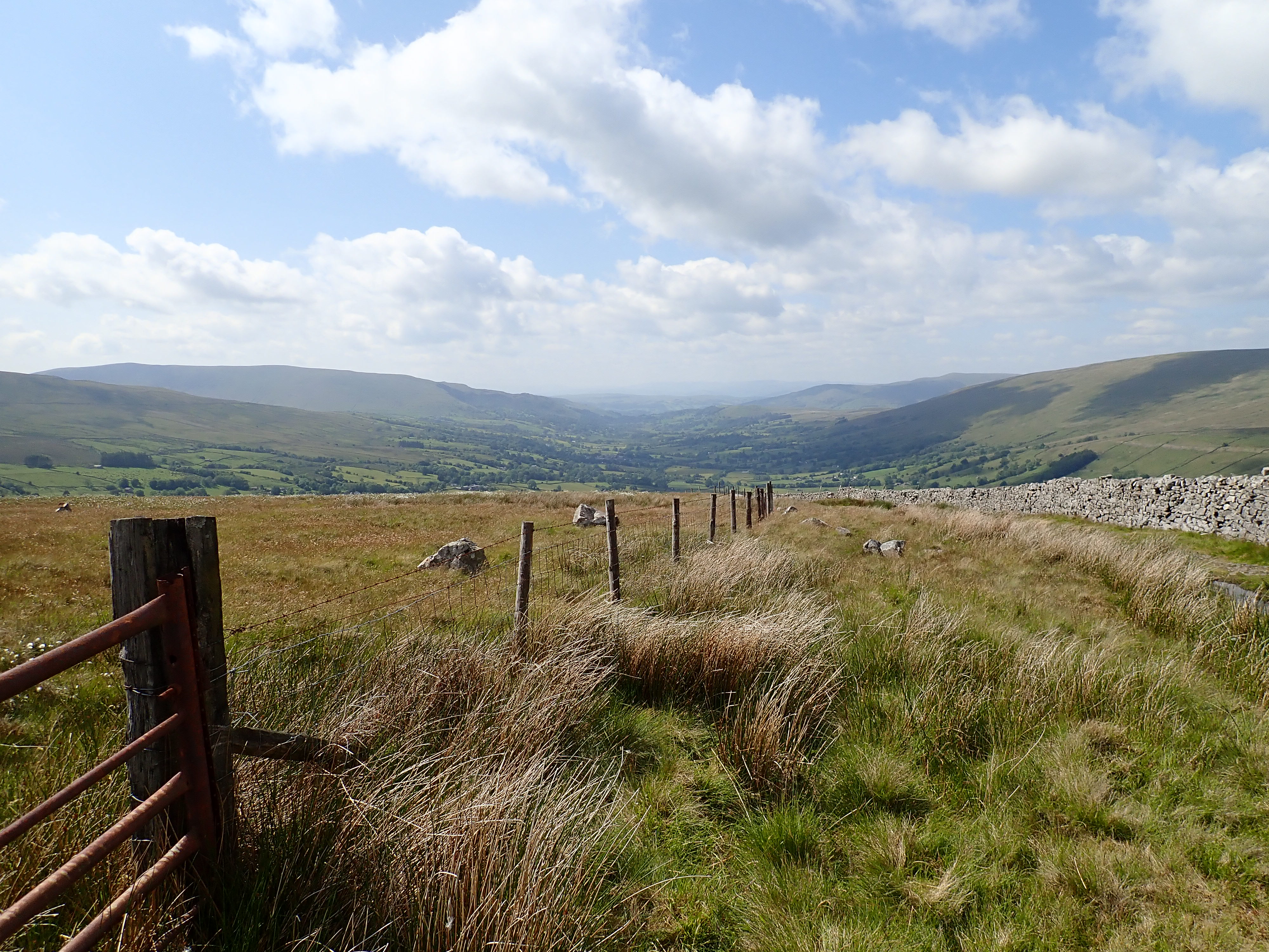The next section of my walk was far from delightful, as I sweated and strained my way out of Deepdale. I took a clear path up through woods to the edge of the moor. As best as I could tell, the path then went through a mix of fences and corrugated iron that was an old means of funnelling sheep into an enclosure. From there, I crossed a stile onto open moorland cut through by a couple of gills. What seemed like the path quickly disappeared as I realised with a sinking heart that this was one of those cases where there was a right of way shown on the map but no actual footpath. Following a bearing, I battled my way over the steep and rough terrain of what my map called Tough Hill. I was exhausted by the time I reached the clear path of the Dales High Way. There was a wonderful view from here down into Dentdale, but I only stopped to enjoy it for a minute as I pushed on.