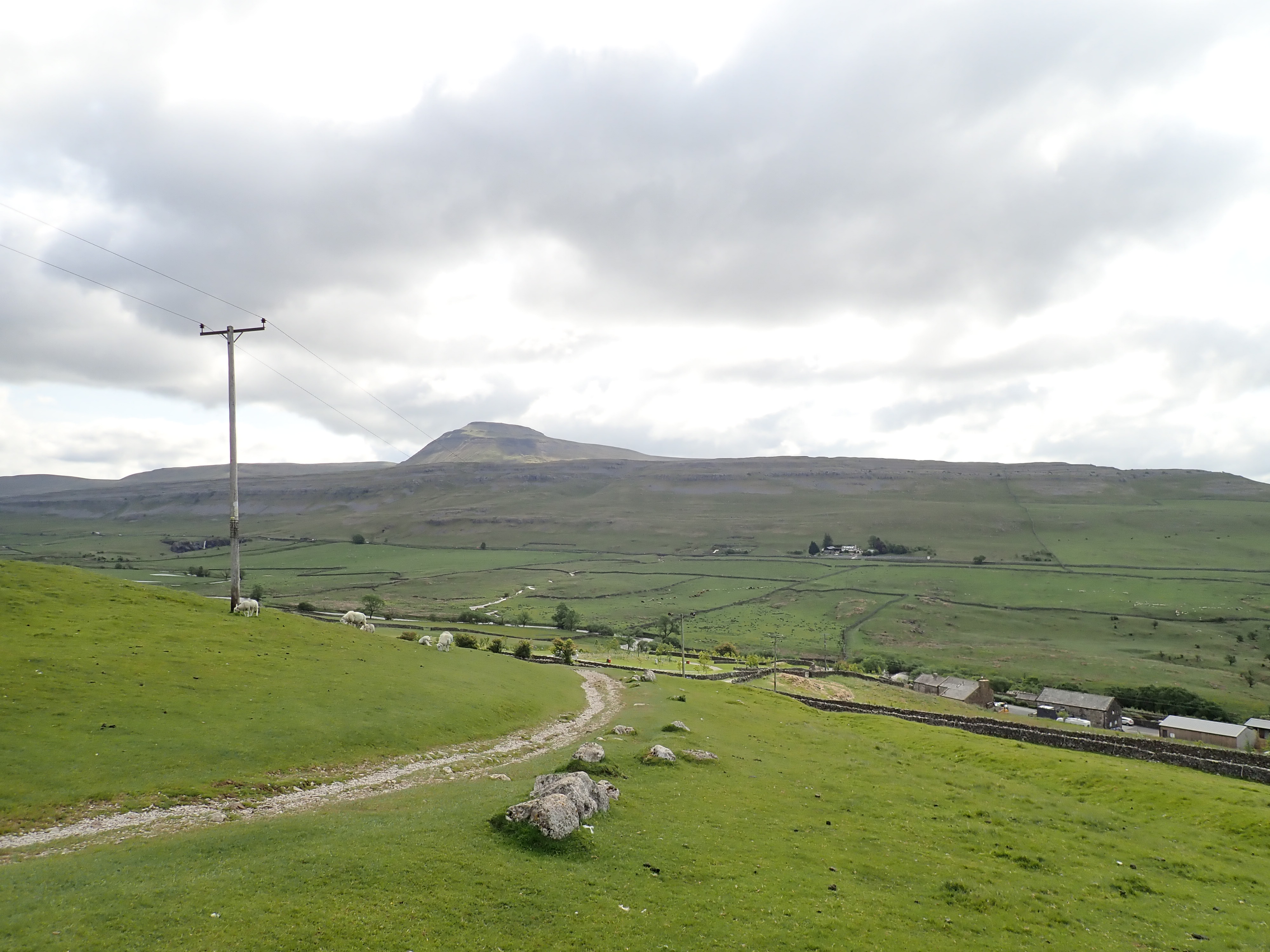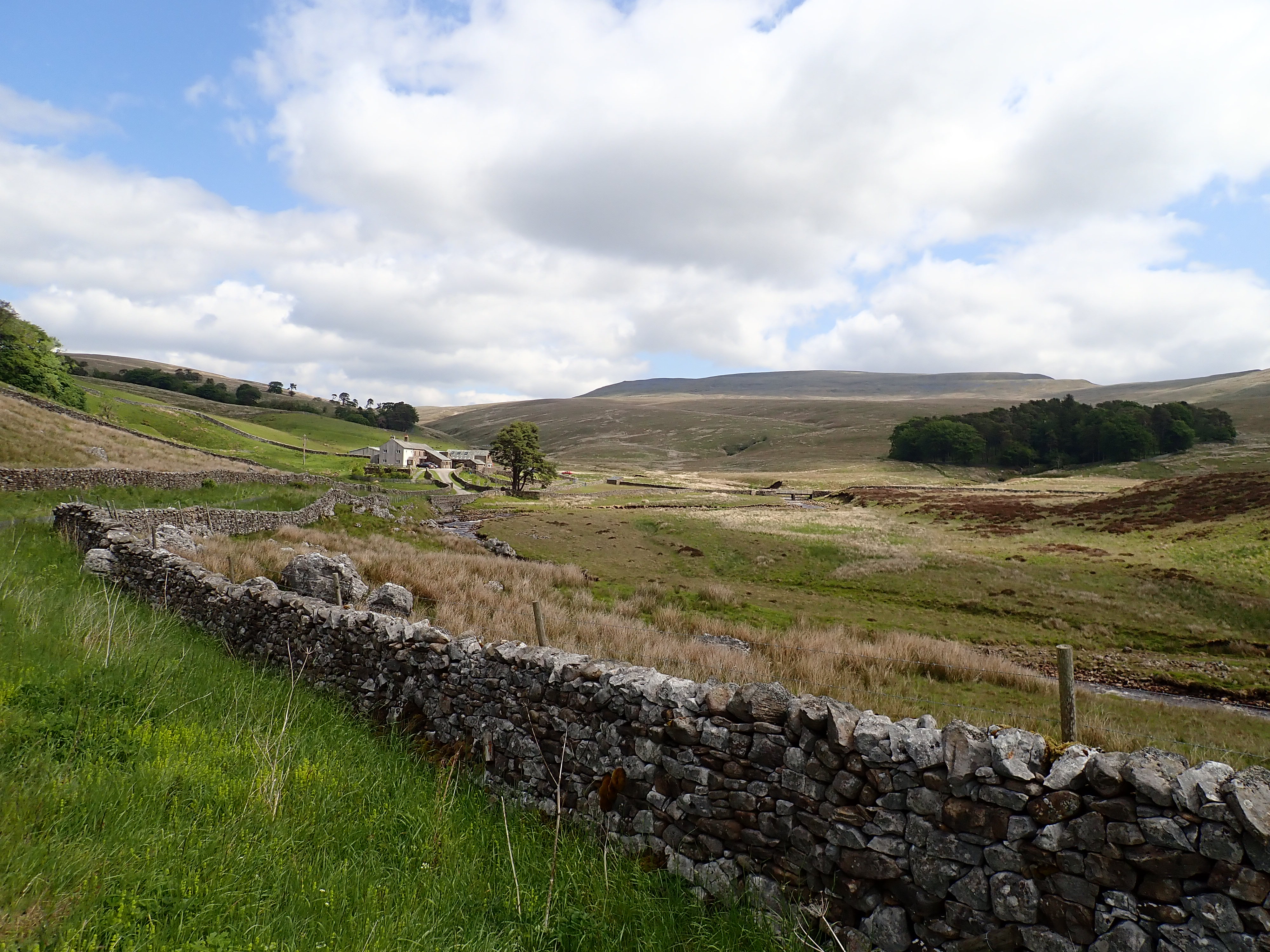 My route traversed the side of Kingsdale before gradually descending to the flat floor of the valley. This shallow dale with limestone scars on either side and bright green pastures at the bottom was pretty. Unfortunately, it was tough going over the rough moorland, with the path occasionally hard to follow. It felt like a long time before I reached the pastures and easier walking near Braida Garth Wood. I passed through Braida Garth farm before crossing fields to a sturdy wooden footbridge over the River Twiss. From here I got good views of Whernside and its SW ridge.