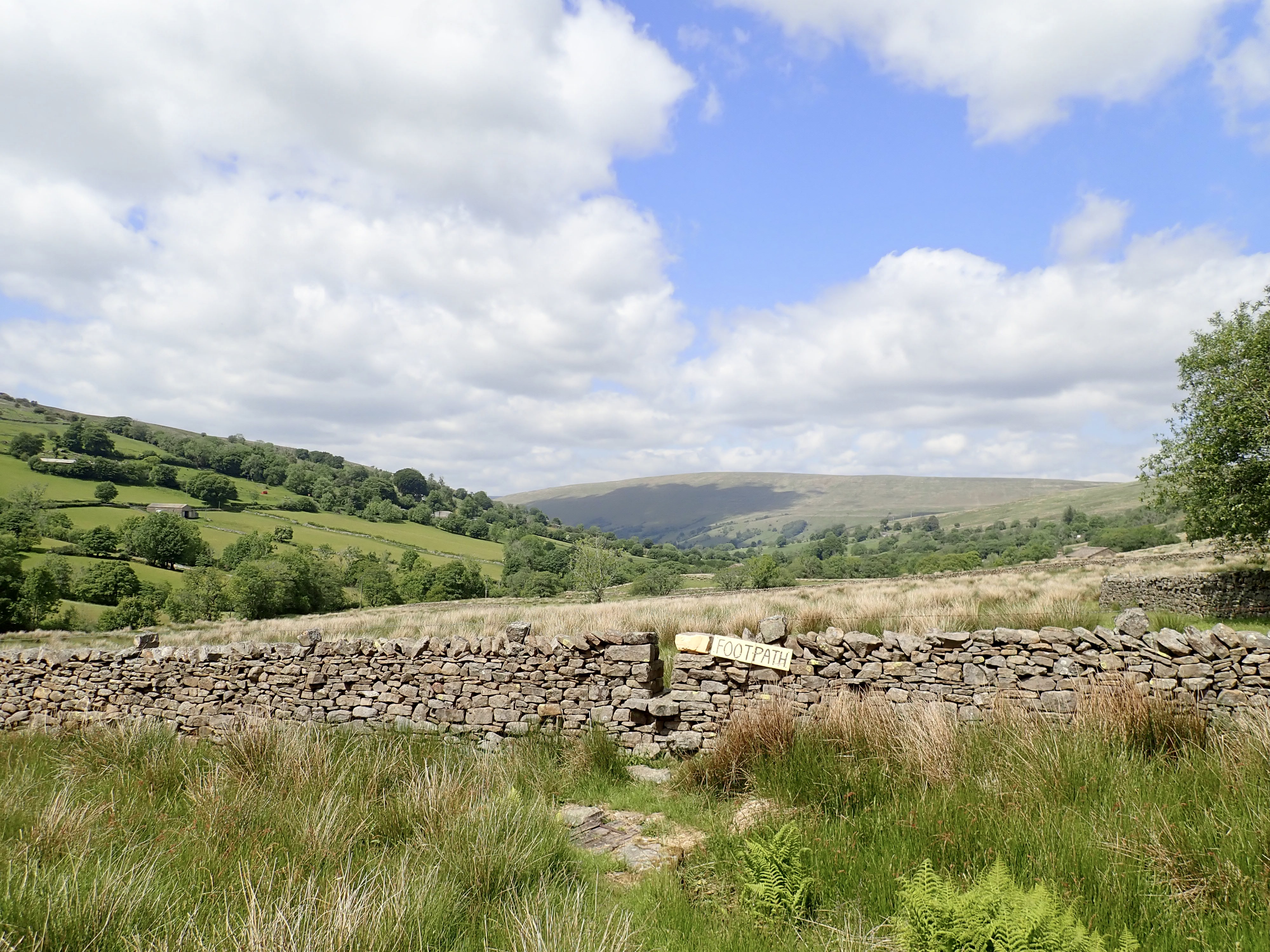 After this strange and slightly sad introduction, I enjoyed walking through the lovely and quiet Deepdale. My path took me through the farm at Deepdale Head (where the limestone bedrock forms the floor of the courtyard), through pastures, and over becks. The farmer had put up large “FOOTPATH” signs at regular intervals, backed up by yellow paint, to show the way. Unfortunately, when these signs stopped appearing, I had some trouble finding the path. After some efforts, I emerged into a meadow with a path cut into it up to the cottages at Hingabank. The owner of one of the cottages said hello and explained the effort he had made to ensure that the footpath over his land was clear. The footpath took a diagonal line through the garden very close to the front of his cottage. He had built a path with a series of solid wooden steps up through the garden and even attached the arrow roundel for the footpath to one of these steps to make the route clear. It had evidently taken a lot of effort and was delightful.