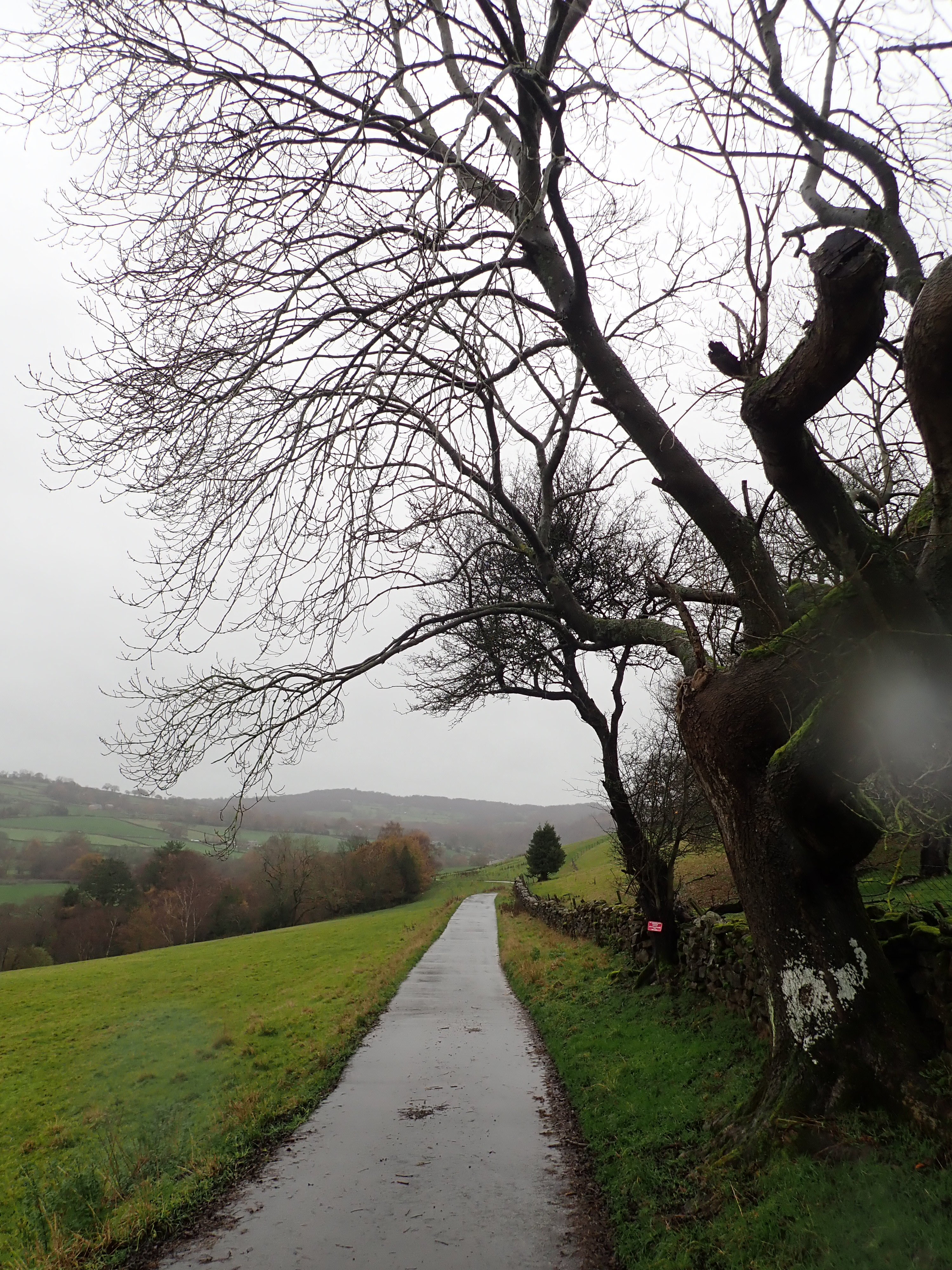 The forecast had been right about the incessant rain that was falling out of dull, grey, low clouds. I crossed the swollen Nidd by Glasshouses Bridge and turned to walk up a small lane heading down the dale.