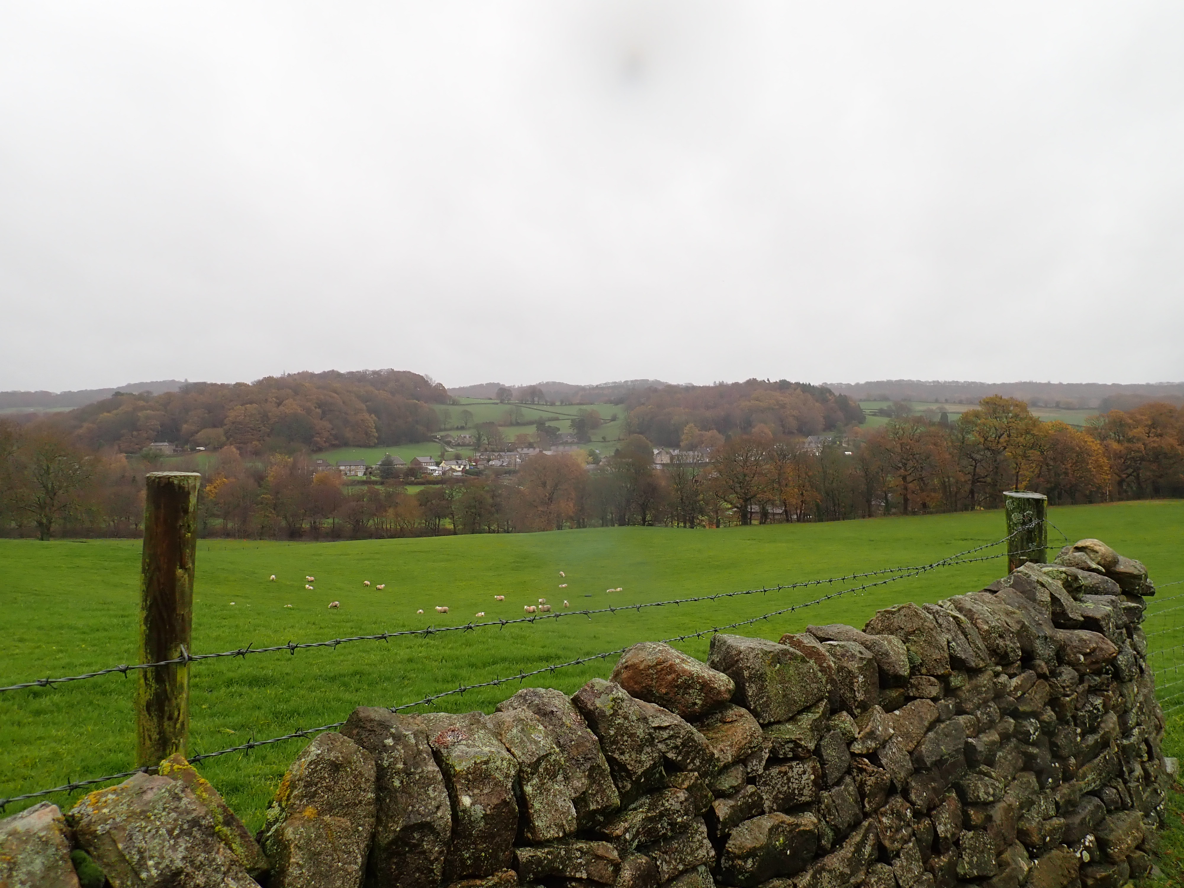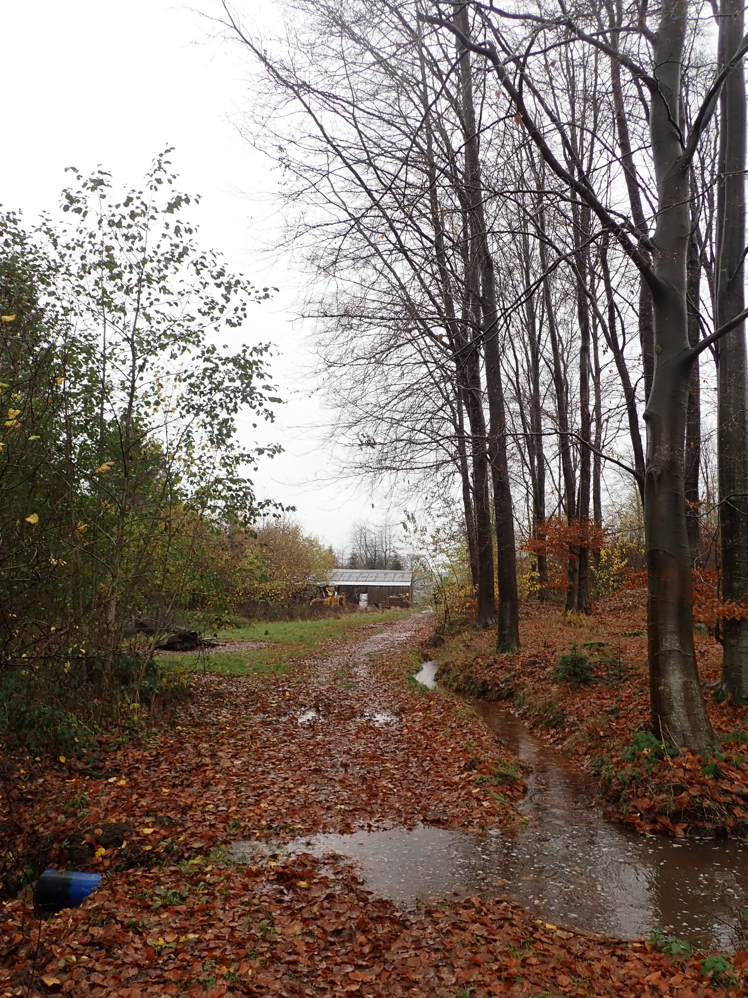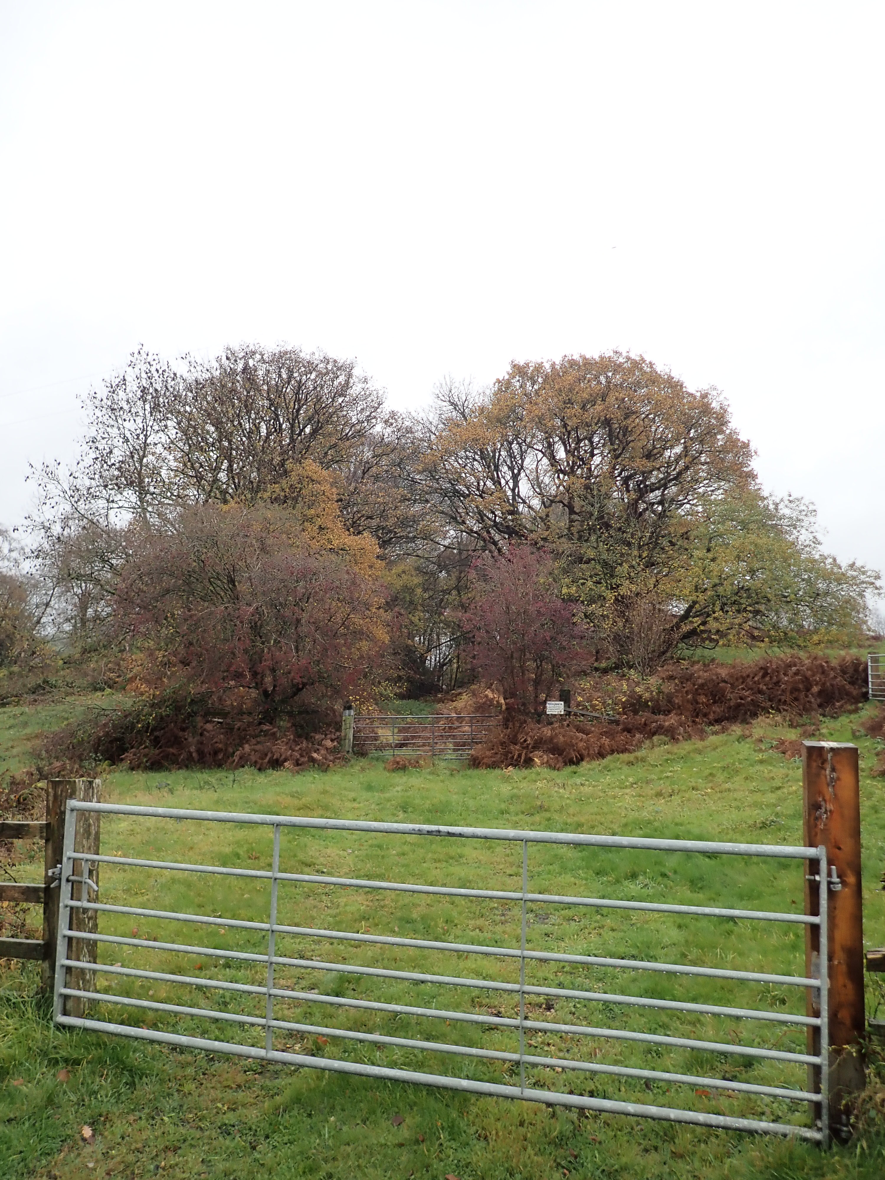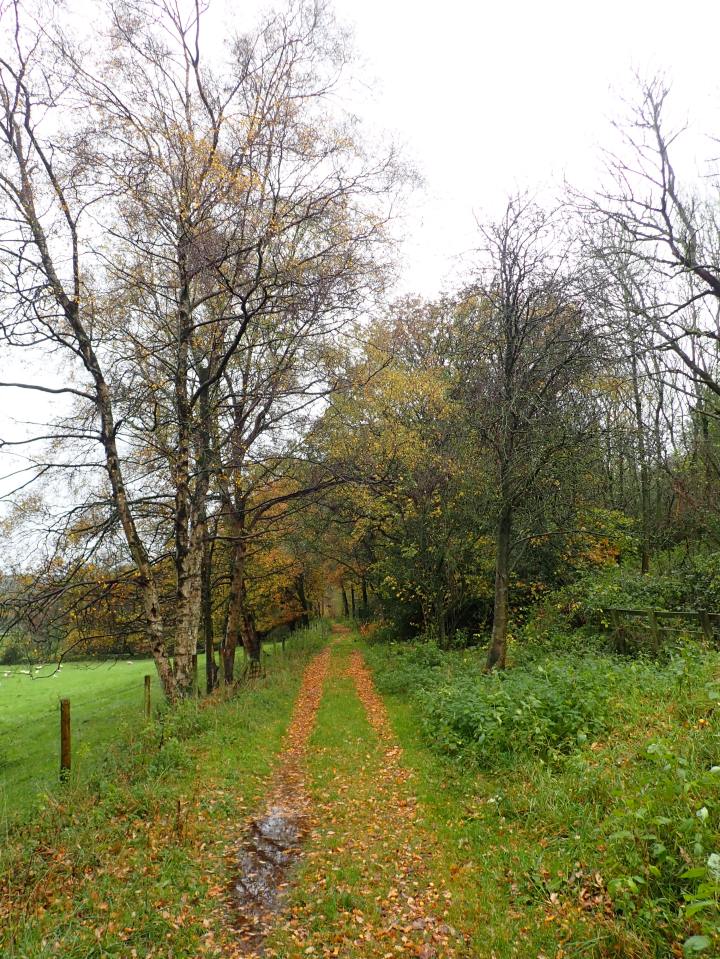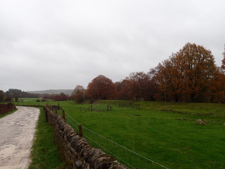 This was the section of the dismantled railway line that I could walk along, and which had attracted me to this route. It traversed the side of the dale to the farm at Low Hall, where the route of the old railway line crossed the entrance to the farmyard and then went into Low Hall Wood. The walk along an embankment through these woods was lovely and my favourite part of the day. The woods were peaceful, and there were still some colourful leaves on the trees and scattered on the ground. I also saw three sika deer, who looked back at me for a minute or two before gently bounding off.