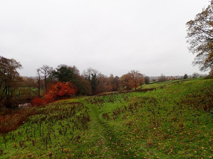 The track I was following continued on to pass Holy Trinity Church, run behind a line of terraced houses, and emerge on the main road through Dacre Banks. I walked past old and new stone cottages until I took a lane past the village pub. The footpath I needed was not straightforward to find as it passed close to cottages and had hard to spot signs. However, I eventually managed to find my way to a stone stile into a pasture, where I walked uphill to rejoin the line of the Nidd Valley Railway.