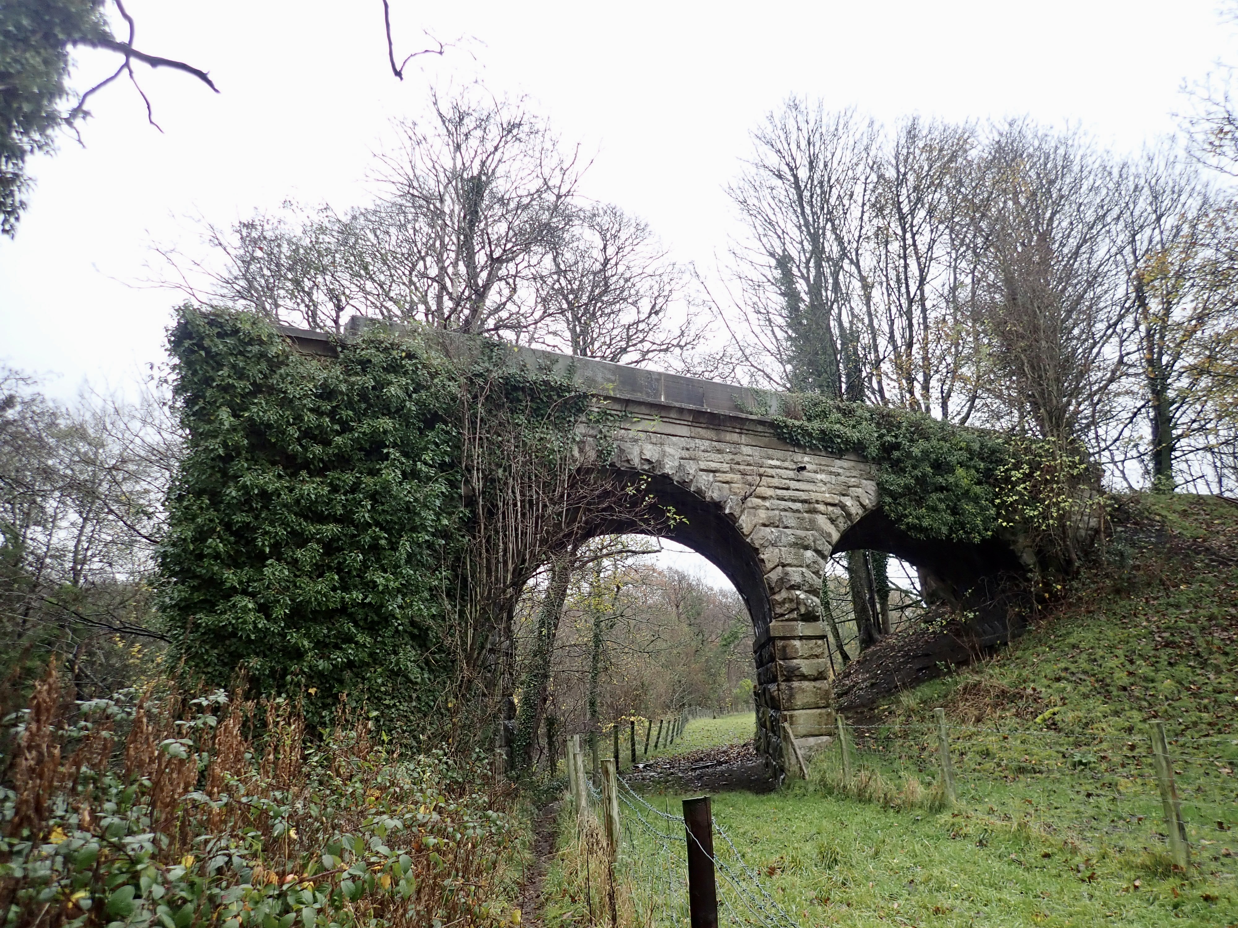 My footpath carried on down the dale. My map showed that the line of the Nidd Valley Railway was running parallel to me a little further down the slope, but I couldn’t see any sign of it. However, when I got to Lead Wath Wood I could make out through the trees what looked like a bridge over a beck. This was the point on the walk where I first came to the old railway line, but it was far from obvious. The flat ground that had been the track bed many years ago now had on it a sawmill and a cottage. It was only when I came to the edge of the wood that the line became clear as an embankment ran arrow-straight away from me across the fields.